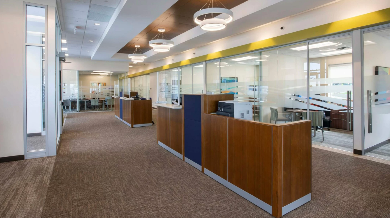 The new design embraces a contemporary banking model, featuring an open floor plan that supports both convenience and personalized service. Self-service kiosks offer quick, independent transaction options, while walk-up desks replace the traditional teller line, allowing for a more approachable and streamlined experience. For clients seeking privacy, semi-enclosed enclaves provide quiet spaces for one-on-one conversations without compromising the openness of the layout. The bank’s operational strategy centers around the Universal Banker concept, with cross-trained staff and clear sightlines throughout the space—ensuring that team members can easily assist any customer, at any time.