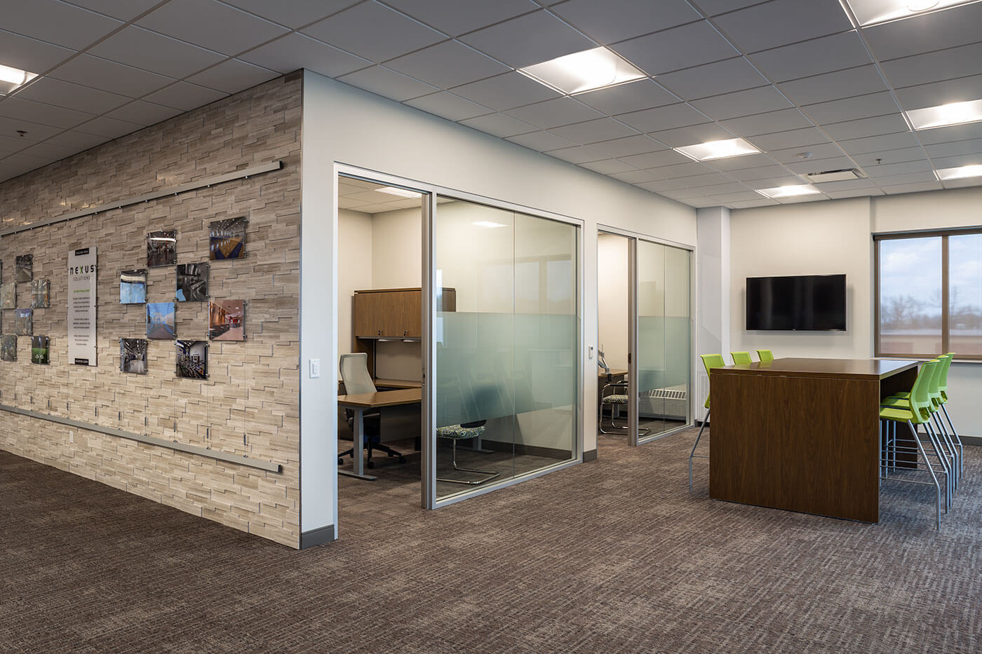 Relocating to a newly designed building in Maple Grove, MN—also crafted by Mohagen Hansen—Nexus sought an office space that balanced technical sophistication with an inviting atmosphere. Leveraging Revit technology, Mohagen Hansen created multiple 3D design scenarios, allowing Nexus to explore various spatial configurations before finalizing their ideal layout. The result is a thoughtfully designed workplace featuring private offices, open workstations, conference rooms, and dynamic collaboration areas. Full-glass office and conference room fronts enhance transparency, while specialty acoustical wood ceiling details introduce warmth and elegance. The design carefully balances a high-end aesthetic with a cost-conscious approach, ensuring Nexus maintains a strong market presence without appearing extravagant.