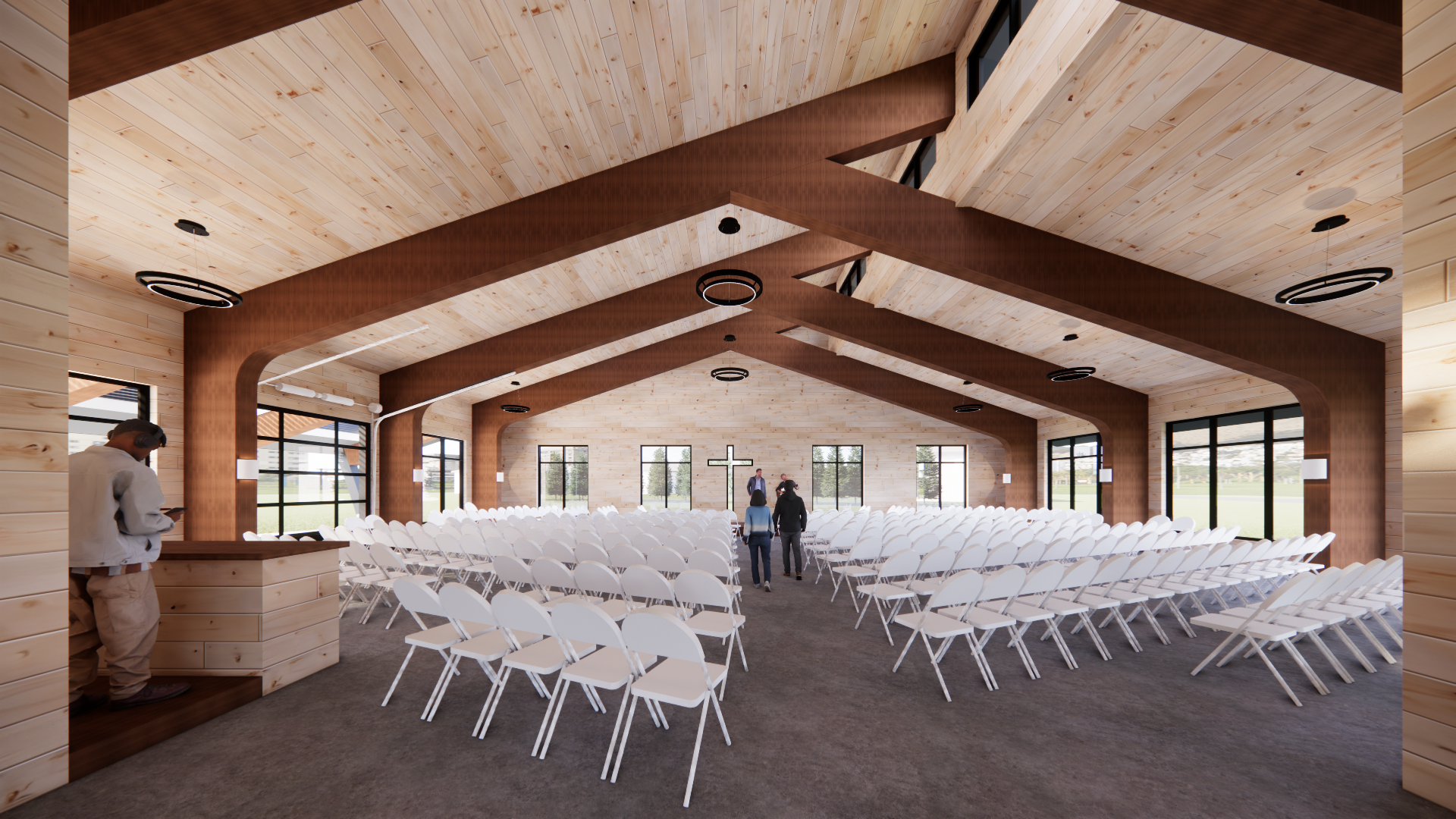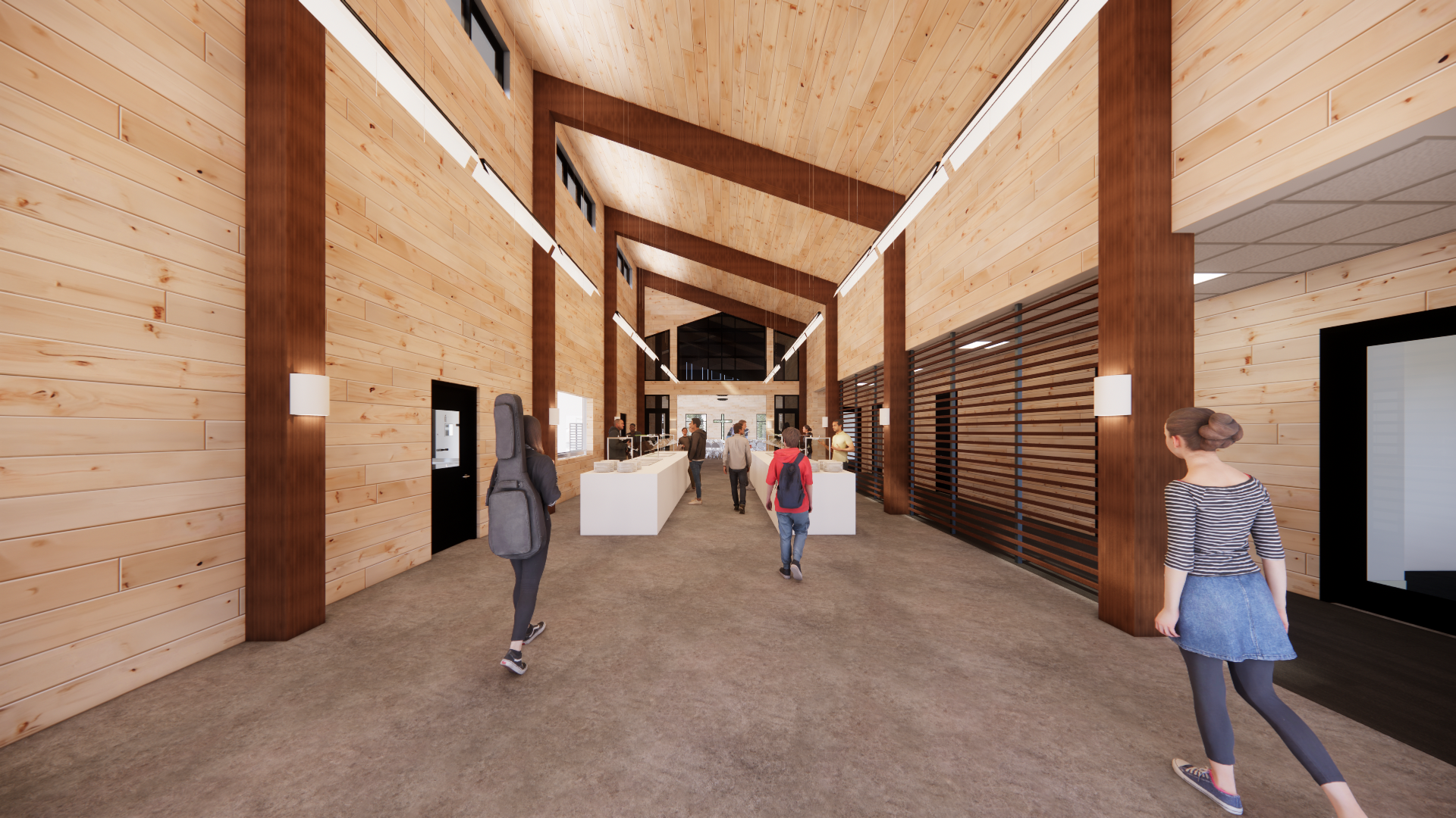 In close collaboration with the RABC team, Mohagen Hansen designed a nearly 9,000-square-foot youth center that prioritizes warmth, comfort, and purpose. The facility features calming natural wood tones, serene exterior views, and an abundance of natural light—an intentional palette to create a peaceful and welcoming environment for students and staff alike. The thoughtfully planned layout includes administrative offices, a conference room, ample storage, restrooms, a fully equipped commercial kitchen, a student lounge, and a bright, inviting lobby. At the heart of the center is a spacious assembly area designed for large group gatherings, community events, and daily programming.